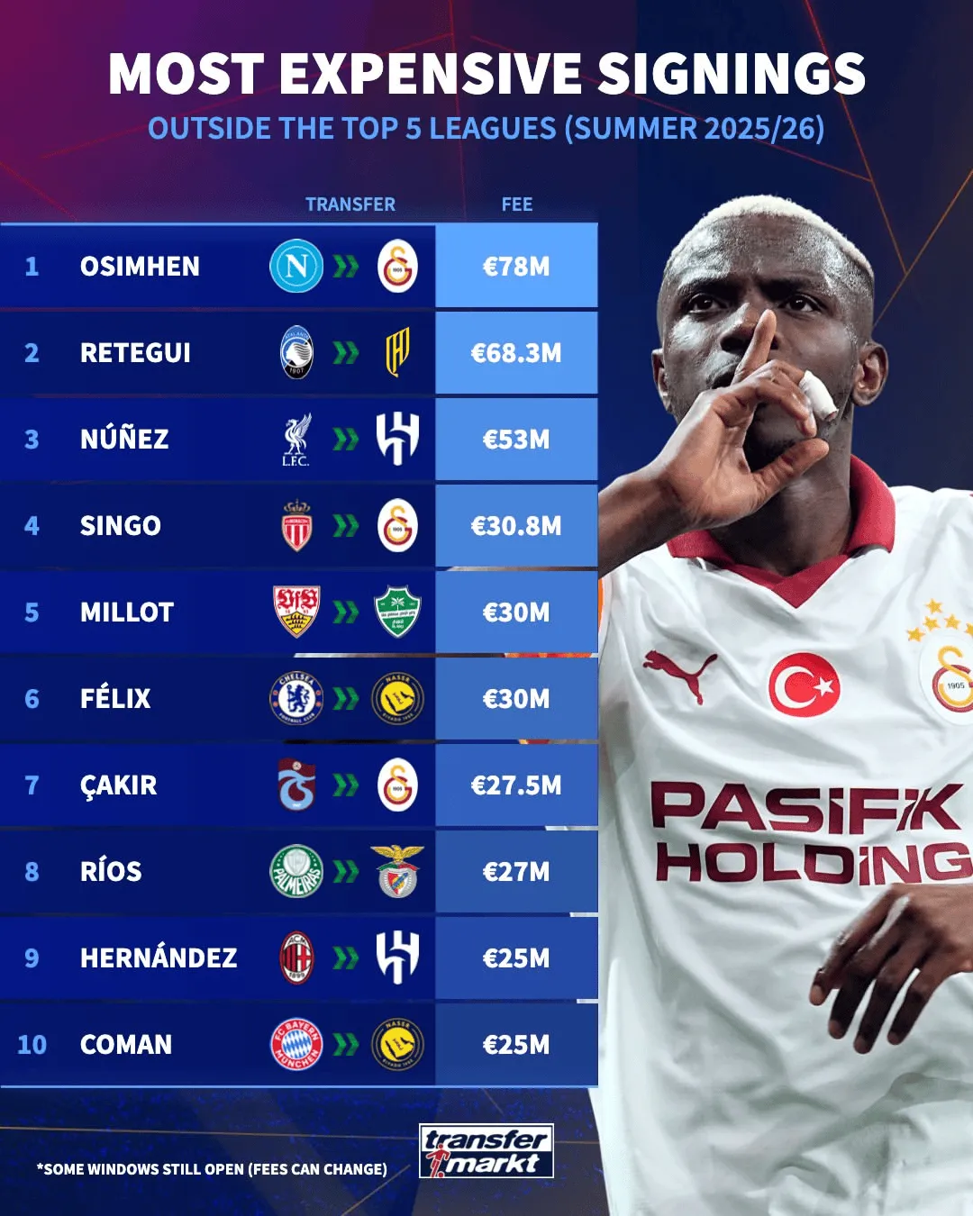 虎扑09月04日讯 随着2025/26赛季夏季转会窗关闭,Transfermarkt公布了五大联赛之外的最昂贵引援排行。其中奥斯梅恩以高达7800万欧元的转会费加盟土耳其豪门加拉塔萨雷,成为五大联赛之外最贵的签约。